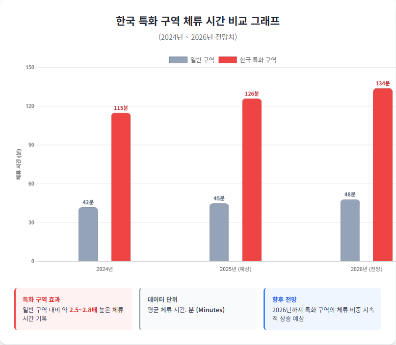 이 그래프는 연도별 막대 그래프로 구성되며, 특화 구역과 일반 구역의 체류 시간 차이를 명확하게 비교할 수 있도록 디자인되었습니다.